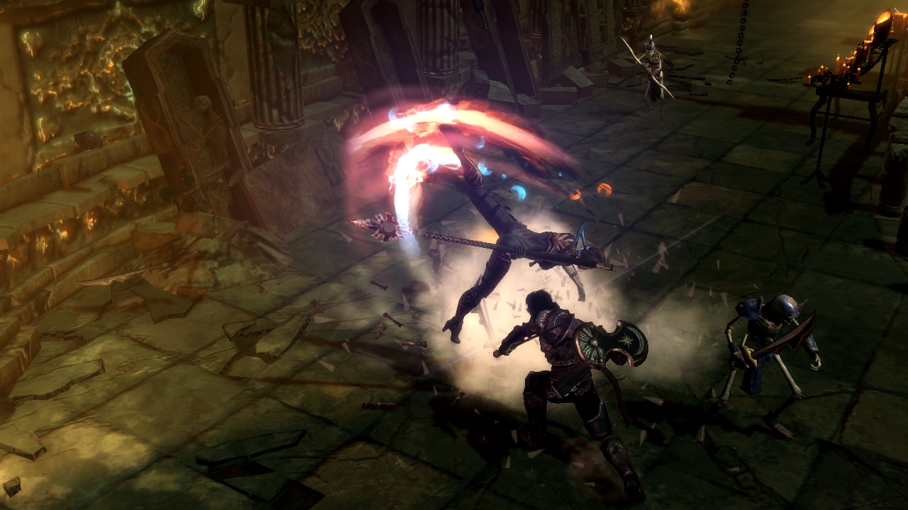 The combat in Dungeon Siege 3 consists of three stances, two offensive and one defensive, with blocking playing a crucial part of the game. Each stance can be switched to at any time and special abilities, attacks, or spells are mapped to each button. According to Co-optimus, Dungeon Siege 3 will support four player online and with two player split-screen co-op with drop-in and drop-out features.