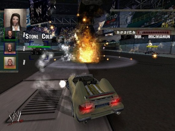Speaking of wrasslin’, THQ puts out a WWE game every year, and they’re always quite good. In 2003, they released another WWE game that wasn’t the usual sweaty-men-groping-each-other-simulator, and it was a … car combat game? Really?