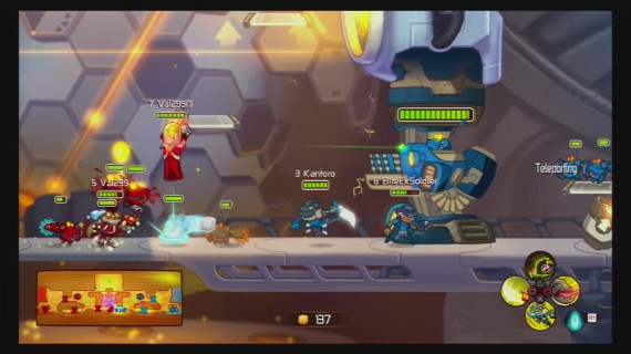 Awesomenauts is a traditional “red vs. blue” team combat game. You play as one of six Awesomenauts, all with their own unique powers and abilities. The goal of each level is to make your way across the field and take over the opponent’s base by destroying their drill. Before you can do so, you need to find a way past two of four gun turrets that can easily kill you in seconds. Teamwork and persistence are highly recommended to take down a turret.