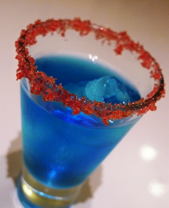 Making the Garnish: Place the sugar in a small container and add the water with a few drops of red food colouring. Shake the container to mix the colour and dye the sugar red. Rub a wedge of lime around the rim of the glass then dip the glass into the sugar to coat it.