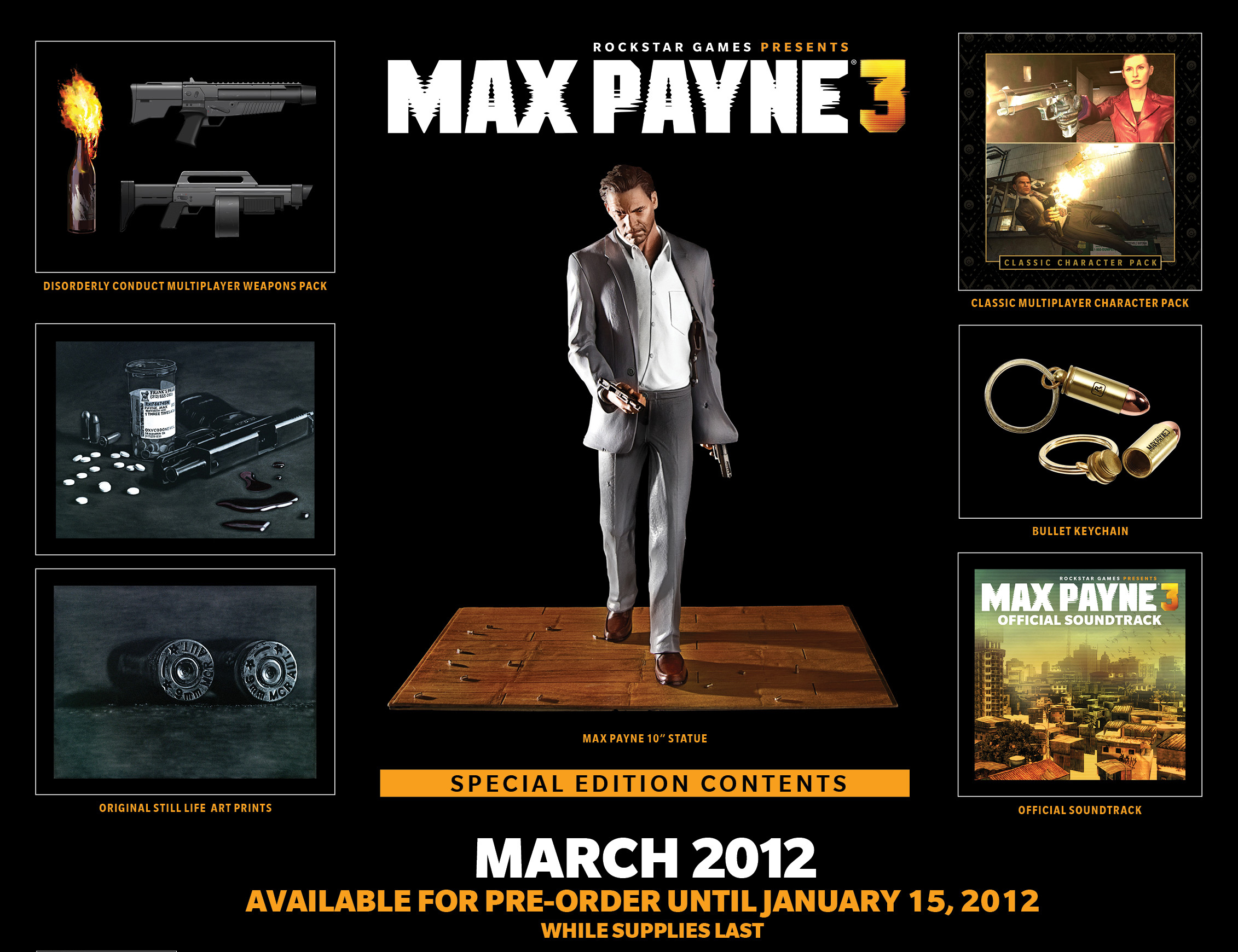 Max Payne 3 must be coming along very nicely, because Rockstar Games have announced a special edition of the game. Unlike other collector-baiting packages, though, Rockstar seems hell-bent on making this a truly limited release — preorders for the Max Payne 3 Special Edition will only be available through January 15th, 2012. Impressive.